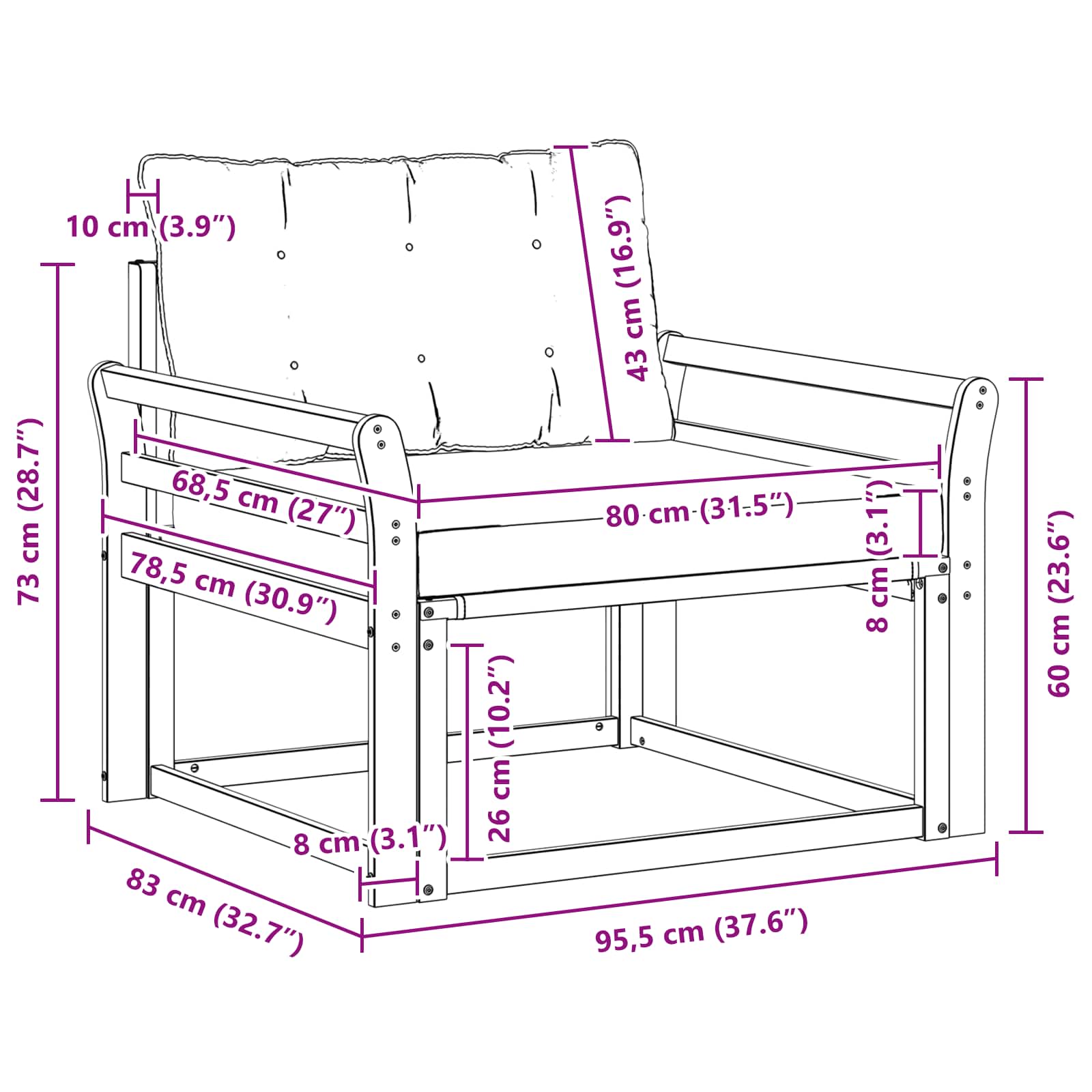 - 1 x Zitkussen: 80 x 68,5 x 8 cm (LxBxH)