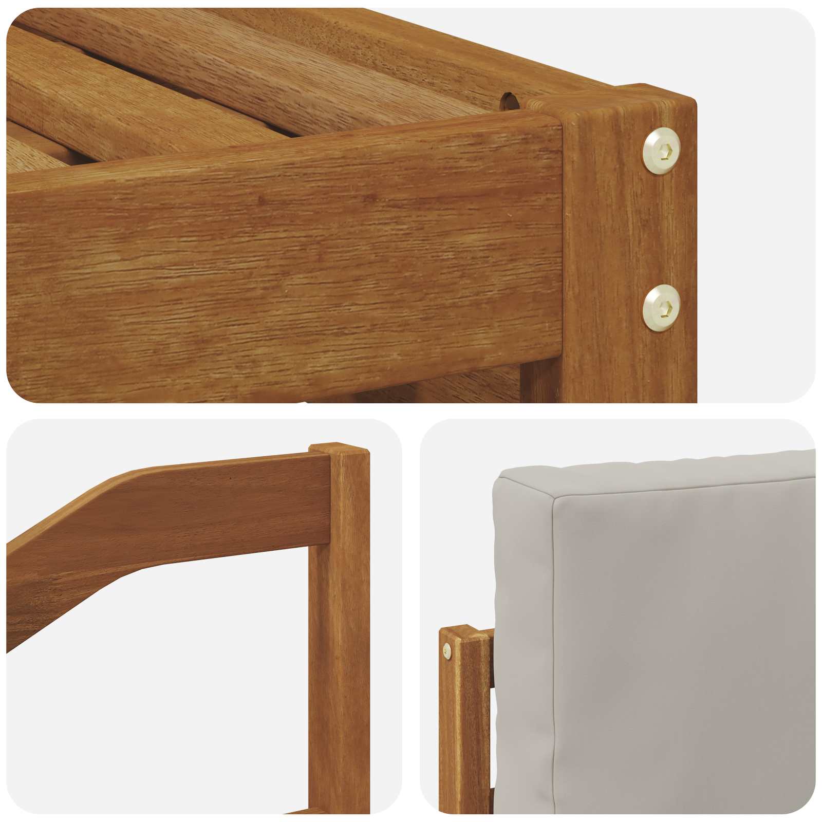 Duurzaam massief acaciahout: Gemaakt van massief acaciahout, deze buitenmeubelset is bestand tegen alle weersomstandigheden. De stevige bouw zorgt voor een sterke basis en langdurige stabiliteit, en de warme natuurlijke kleur geeft je tuin of terras een boost.