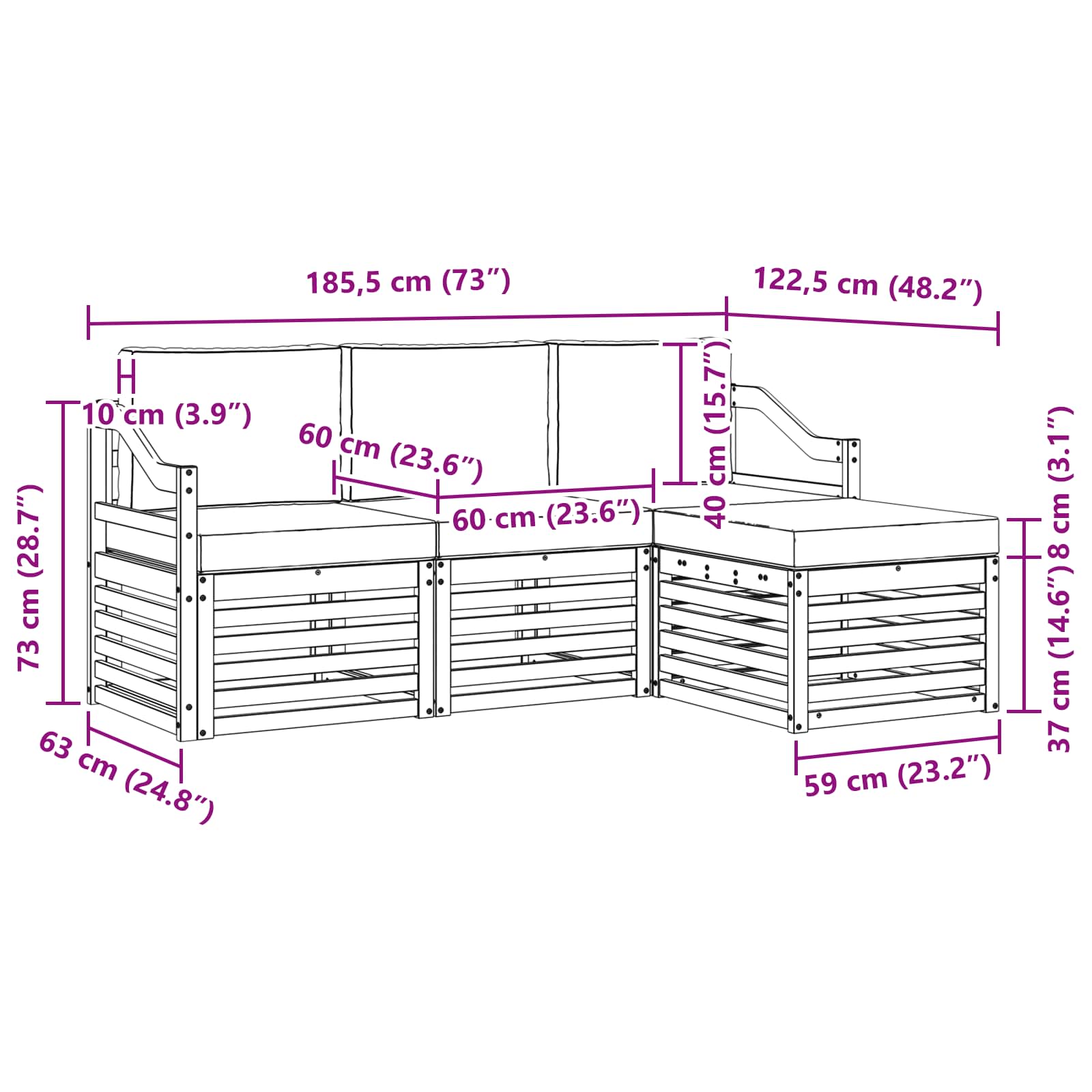 - Totale afmetingen: 185,5 x 122,5 x 73 cm (L x B x H)